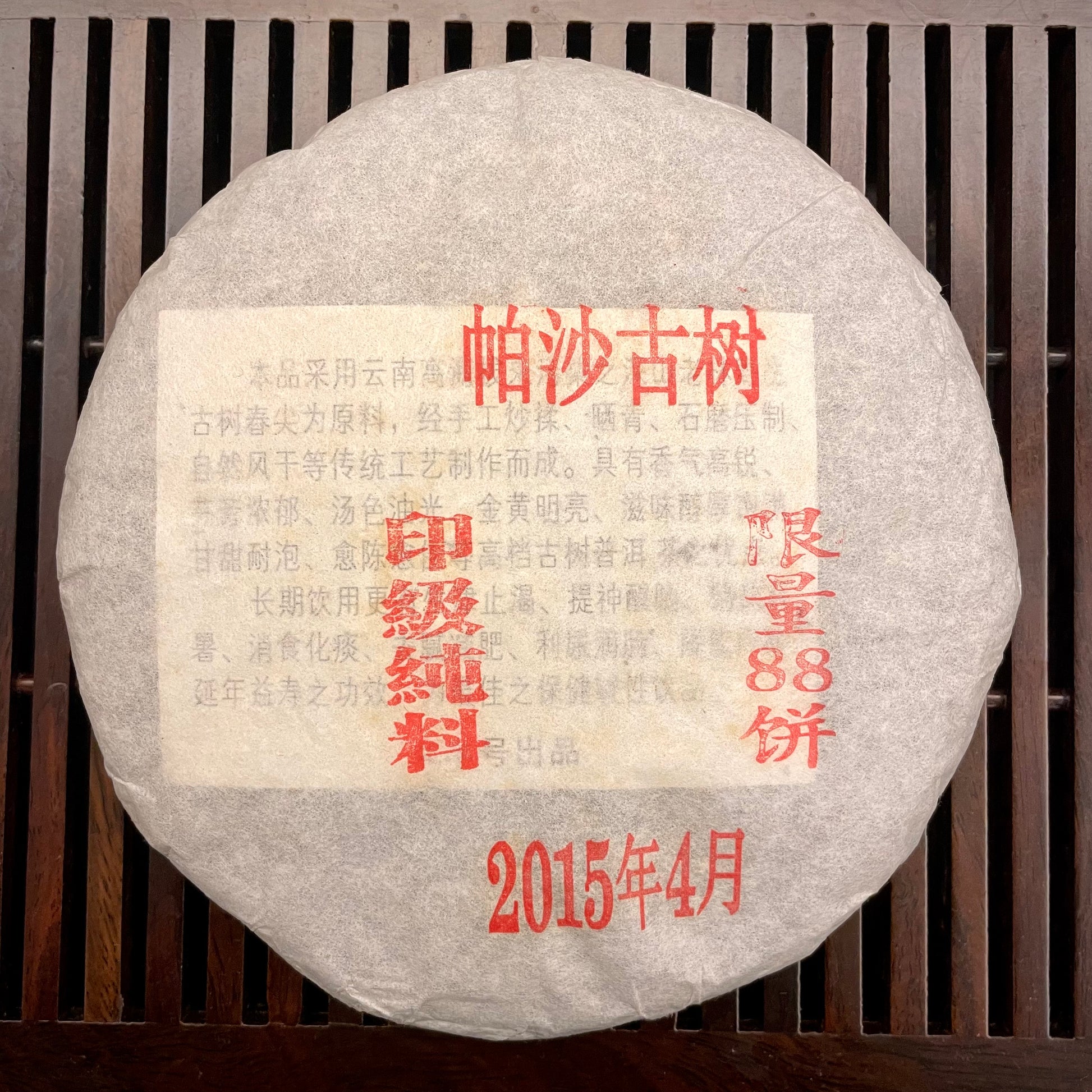 Only slightly over 20kgs of material was harvested from selected older trees in Pasha mountain region (although the wrapper says 88, a lucky number, there was only enough material for 70 cakes). A beautiful cake, this year's material was high quality (albeit expensive) as Mr. Liao secured first bid for this first flush selected picking very early in the season.