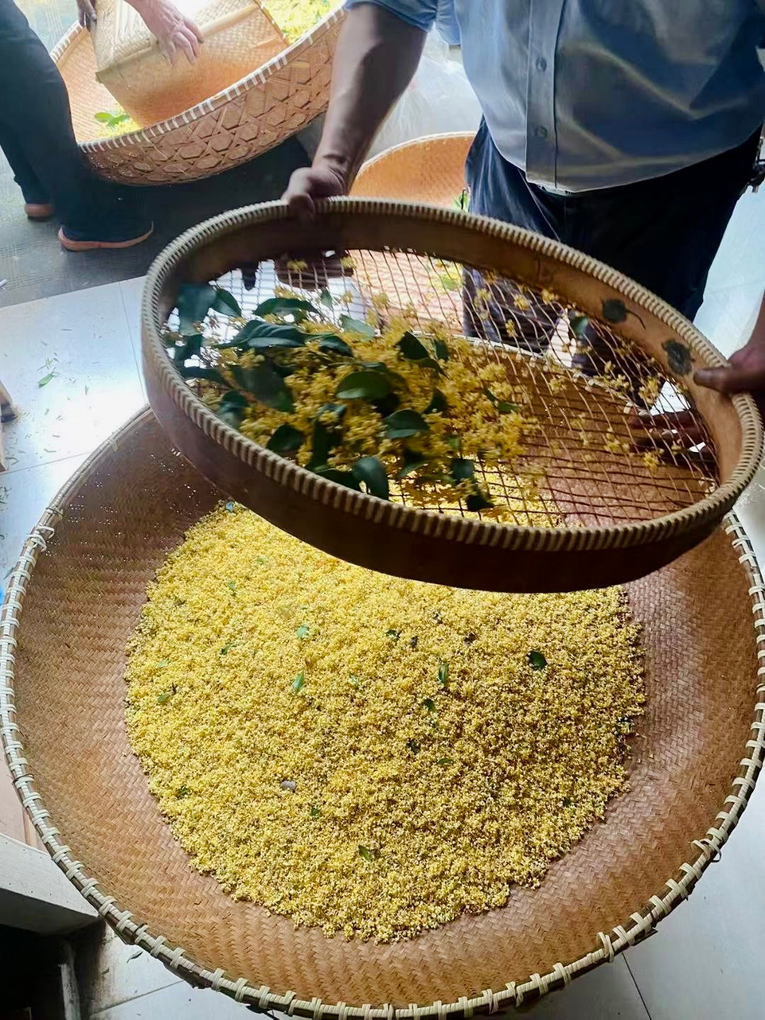 Harvesting and processing these fresh osmanthus flowers is very tedious work. The best quality flowers must be picked at the break of dawn -- our tea farmers wake at 4am and make their way to the trees to harvest only what is needed each day. Each stalk is then hand-processed to ensure the tiny, delicate flowers remain intact.