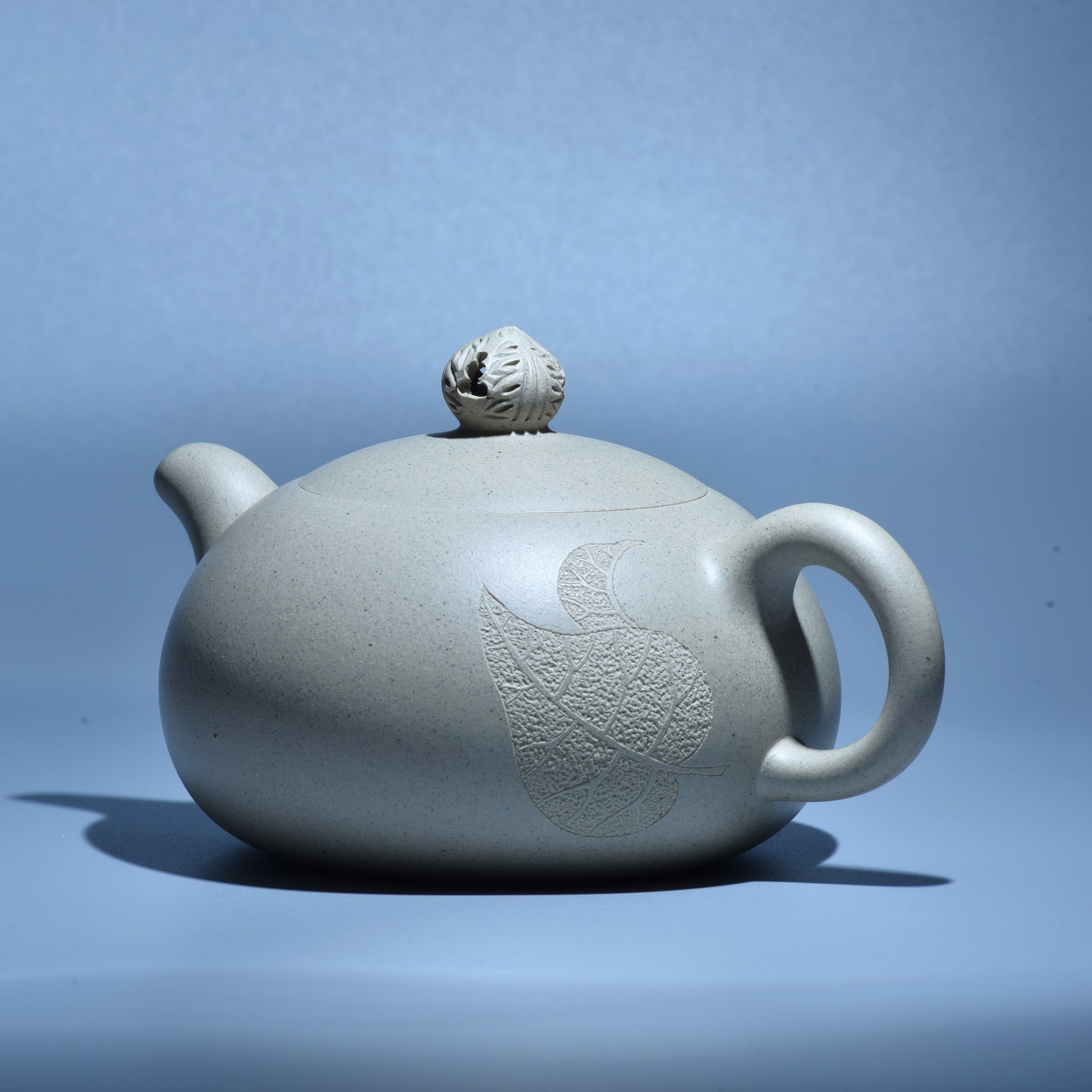 This pot is made from the relatively rare Ben Shan Lv Ni from mine No. 4 in Huanglong Shan. The pot's rounded form gives a sense of harmony and centeredness. An etching of the sacred bodhi leaf motif on the body speaks to humankind's reach for enlightenment through diligence and self-awareness, values also inherent in the tea ceremony.