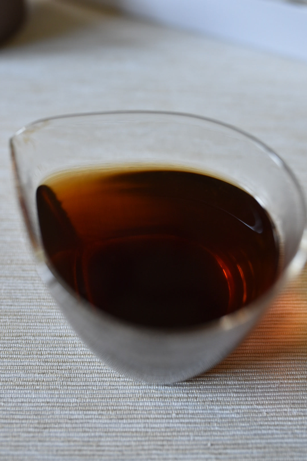 The initial steeps are powerful, with lots of fuzz from the tippy leaf. Less upfront sweetness than expected, flavors are roasted chestnut and cocoa nibs with a hint of citrus peel tartness. A camphorous, medicinal undertone emerges briefly, which will intensify with aging. In mid to later steeps, a surprising roasted sugarcane sweetness abruptly comes to the fore alongside a delicious breadiness. Smooth, lubricative soup with a medium-short clean finish.
