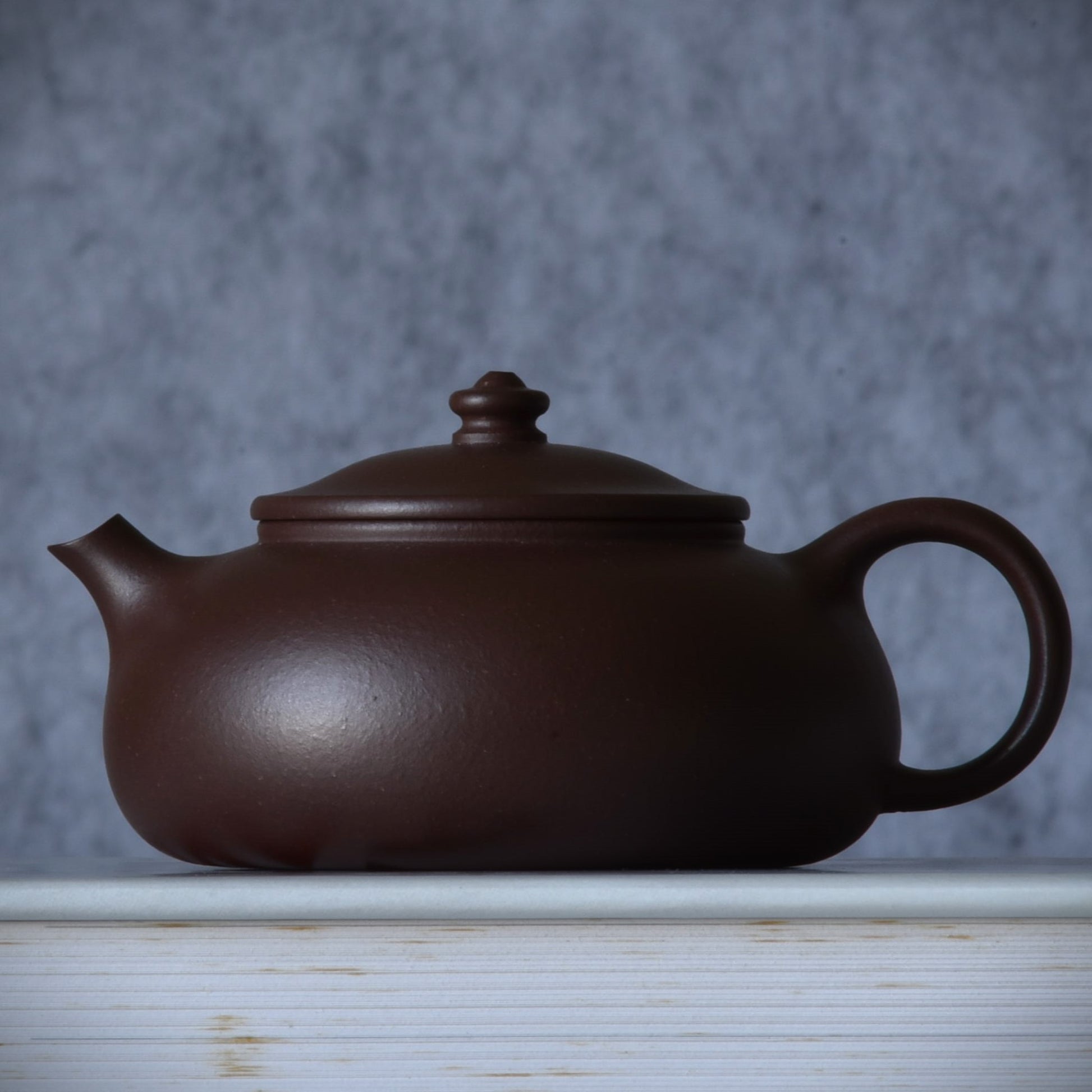 This teapot is an original design by Master Shi Wen Jie, crafted in a superb quality Zini clay from the Shi family's collection which has been well-aged and tempered. This is the same top-grade Zini that her father Shi Yin Zhi uses for his National competition-winning pieces. Examine it closely to find that it has both a creamy quality as well as a tasteful underlying granularity and texture, known in Chinese as 有骨有肉 (with both flesh and bone structure). With use, it will season rapidly to reveal a lustrous, deep-hued patina reminiscent of well-preserved antique zisha pieces.